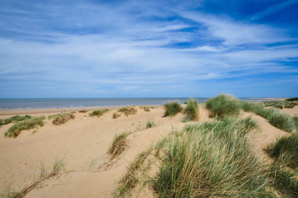 The shoreline is wide and sandy at low tide, with long views across The Wash. It sits adjacent to Holme Dunes Nature Reserve.