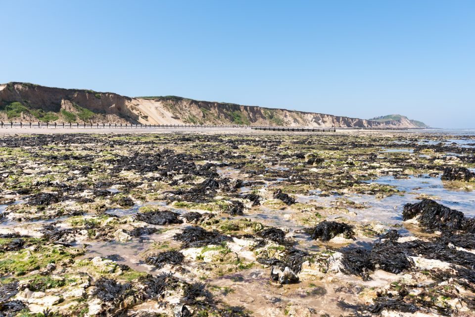 The beach is known for its geological interest, including fossil remains discovered in the cliffs. Rock pools are visible when the tide recedes.
