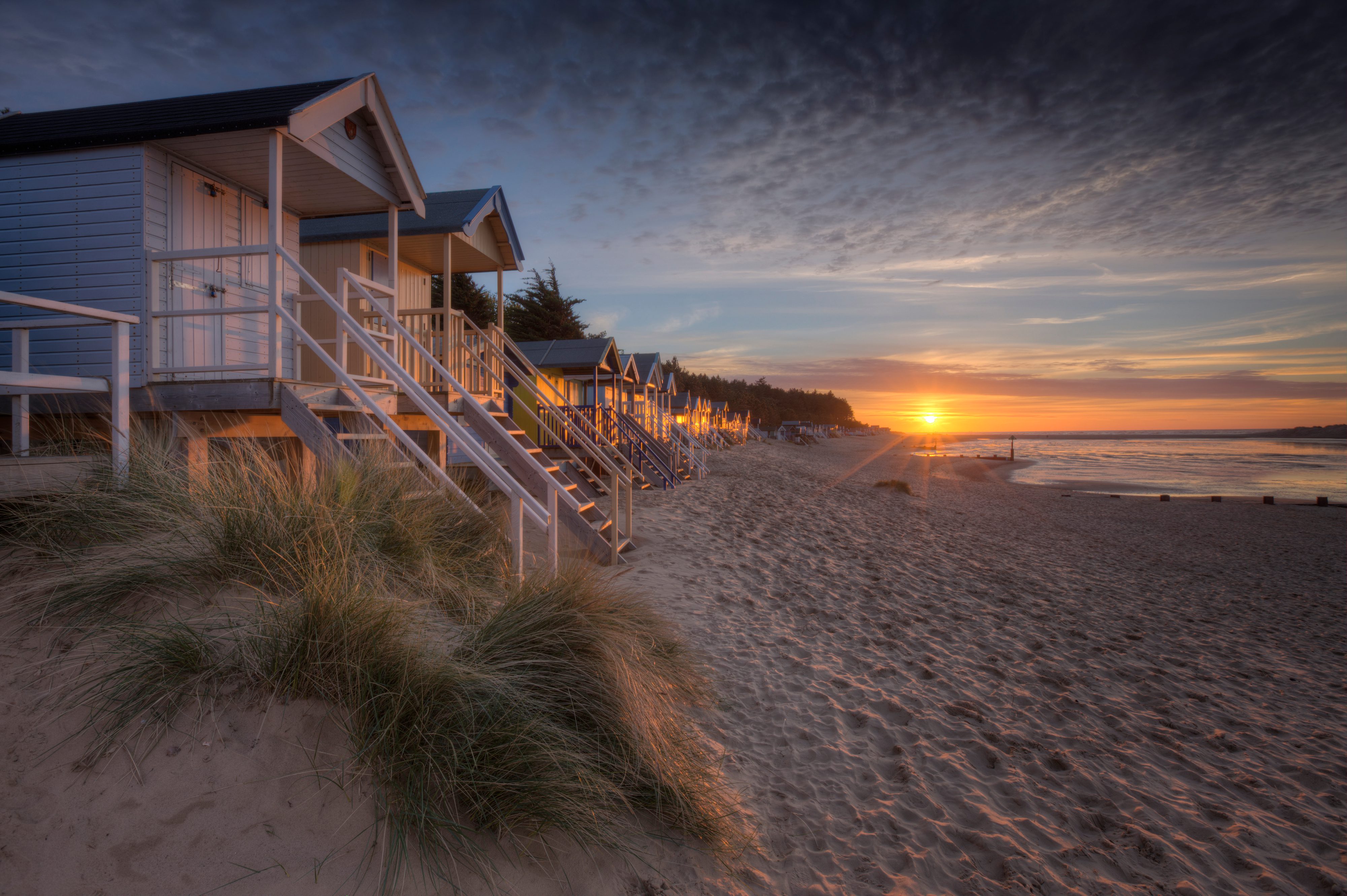 Beach huts at Wells-next-the-Sea, high tide at sunset
